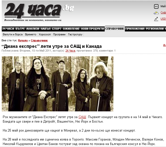 Една от най-популярните и обичани български рок групи “Диана Експрес” ще представи своя нов двоен албум ” Площад Синева’” по време на концертно турне в САЩ и Канада. Първият им концерт ще бъде в Чикаго на 14-ти Май, 2011, Събота, след което ще направят обиколка на САЩ и Канада. Турнето е посветено на 24 Май – Денят на Българската Култура и Писменост. .....