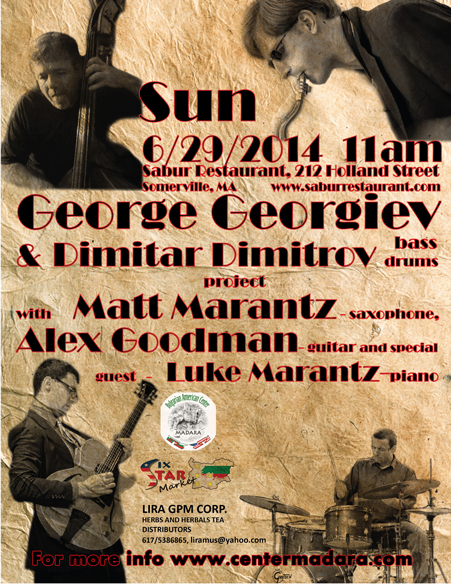 DD and GG jazz project includes Matt Marantz – Sax, Luke Marantz- Piano and Alex Goodman - Guitar. They will play in Boston on June 29, 2014 , 11.00 am at Sabur Restaurant, Somerville, MA. In the program are standard jazz compositions and own music.